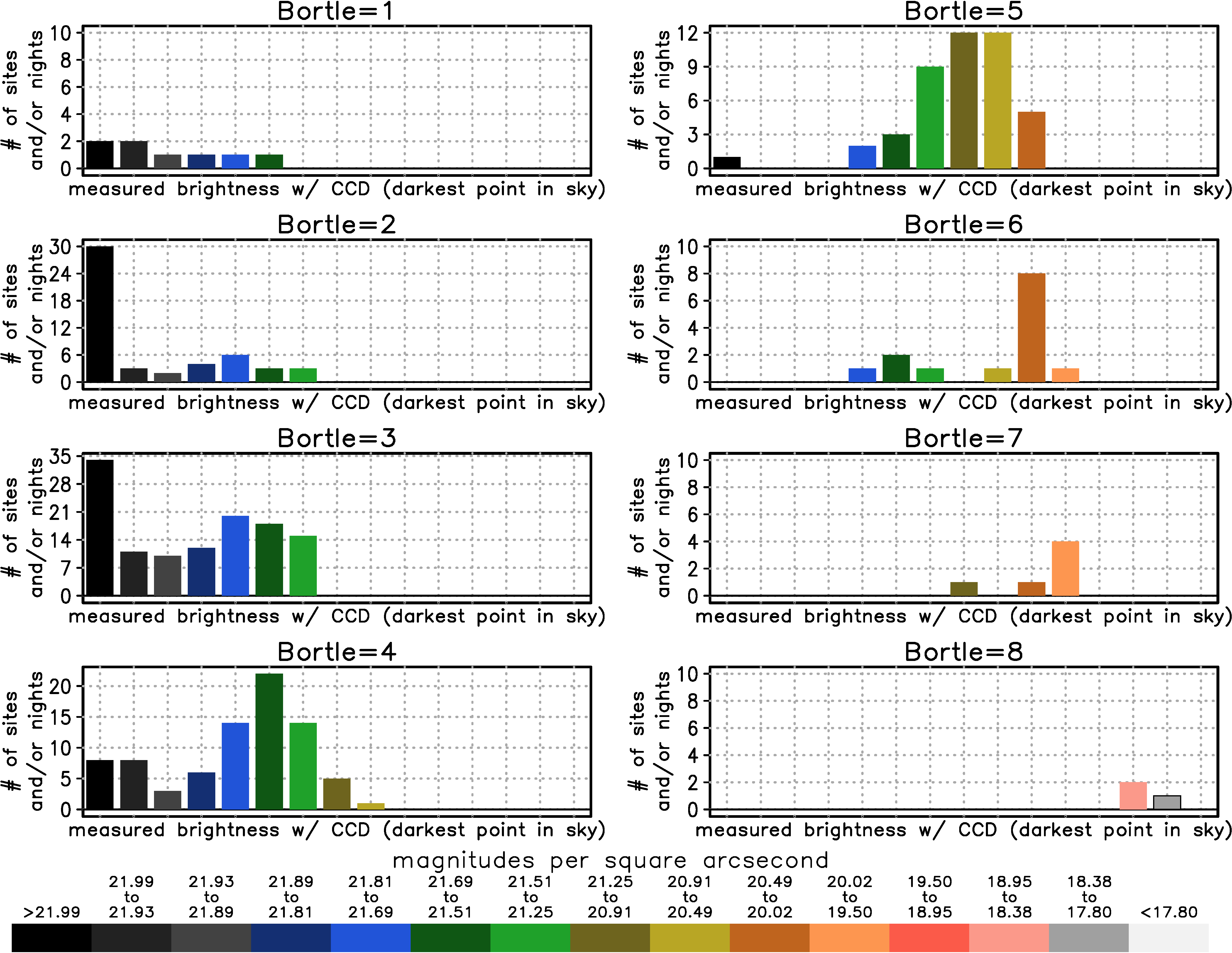 In the plot below, I show the distribution of sky brightness for each Bortle class. For example, for the top left, I take all sites and nights (some sites were observed multiple times on different nights) that were classified as Bortle 1 in the dataset. Next I take the brightness measurements for those sites and place them in the Light Pollution Zones that you find on my light pollution maps. So for Bortle 1, 2 sites were darker than 21.99 (Zone 0), 2 sites were between 21.99-21.93 (Zone 1a), and one each were in brighter zones out to 21.69-21.51 (Zone 3a). Note that even though I classify in Light Pollution Zones, this is not from an atlas. These are actual measurements.